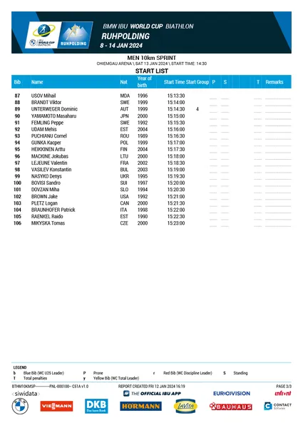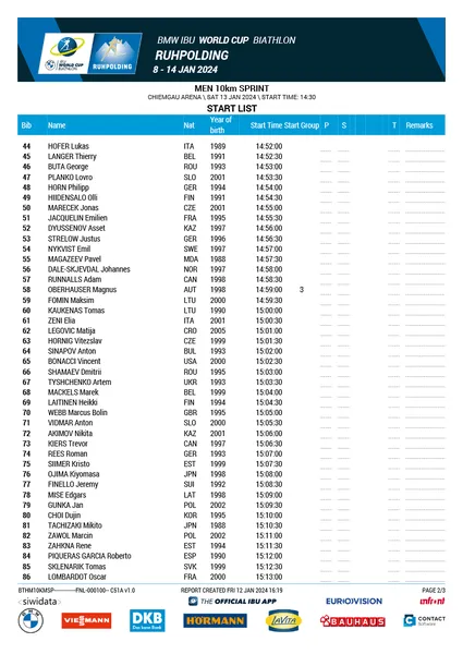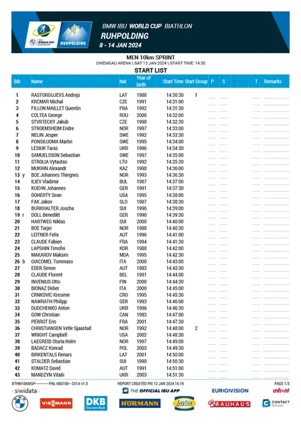 COUPE DU MONDE BIATHLON 2023/2024 LA LISTE DE DÉPART DU SPRINT masculin DE RUHPOLDING 2024