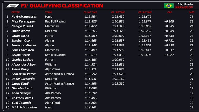Après une interruption de plusieurs minutes, le chrono redémarrait mais la pluie avait débarqué dans le ciel brésilien. Sergio Pérez 9e, et Lewis Hamilton 8e, tentaient un tour en pneus intermédiaires qui ressemblait plus à une parade. Au terme des huit minutes restantes, Kevin Magnussen pouvait laisser éclater sa joie dans le box Haas. L'ensemble de l'équipe se félicitait alors que Guenther Steiner, directeur de l'équipe, voyait le public l'applaudir à sa descente du muret des stands.