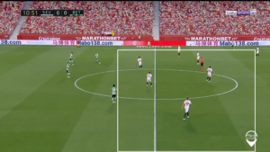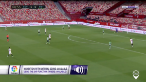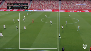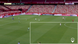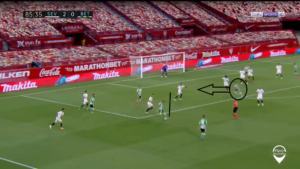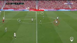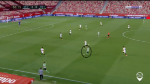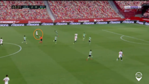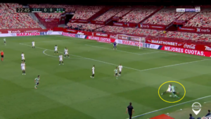 Malgré un retard de deux buts, le Betis affiche un meilleur visage dans la dernière demi-heure. Les entrées en jeu de Diego Lainez, Joaquin et Loren Moron sont accompagnées par abandon du 4-3-3 au profit d’un 4-2-3-1. Sans que cela n’engendre de véritables occasions de but, ce changement a le mérite d’apporter davantage de mobilité aux avant-postes, notamment de la part de Diego Lainez (cercle noir).
