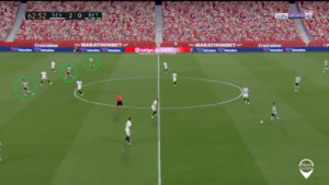 Le Séville FC profite alors de ces espaces. La meilleure illustration est très certainement cette séquence dans les dernières minutes de la rencontre. Pressé par trois joueurs, Thomas Vaclik trouve sans soucis un partenaire sur le côté droit libre de tout marquage.