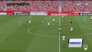 Mais dès le début de la rencontre, les Beticos montrent davantage de lacunes que leurs adversaires. En possession du ballon, l’équipe paraît coupée en deux à de nombreuses reprises, empêchant une progression par du jeu court. Aligné seul en pointe malgré son profil pouvant apparaître comme complémentaire avec un second attaquant plus mobile, Borja Iglesias est presque sevré de ballon.