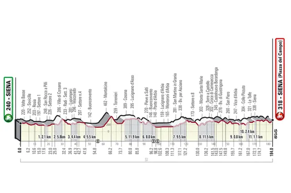 Les derniers kilomètres exigeants, avec des pentes allant jusqu’à 16%, s’approchent de la ville de Sienne le long de sections de route larges et droites, reliées par des virages serrés, des premières descentes et de légères montées. À 2 km de l’arrivée, le parcours rejoint la Via Esterna di Fontebranda, où la pente atteint 9%.