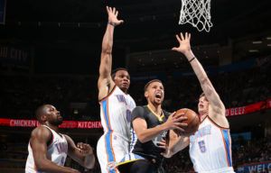 Anthony Morrow l'a vu, avant tout le monde, et gesticule pour prévenir ses coéquipiers. Il connaît la bête, anciennement son coéquipier. Andre Roberson est pourtant prévenu, Curry est en feu. 43 points à 11/15 à 3 pts, et une deuxième mi-temps de folie. Alors que ce match Oklahoma City Thunder – Golden State Warriors est très serré, et se jouera en prolongation, les deux équipes sont à égalité parfaite, 118 partout. Sur un shoot manqué par les locaux, Curry récupère la gonfle à 8 secondes du terme. Il remonte, et ralenti sur la ligne médiane. Alors qu'il reste 5 secondes à jouer et avec un temps mort, les choix son multiple pour le futur double MVP. Mais alors qu'il n'a cessé de rentrer des tirs plus compliqués les uns que les autres tout au long de la partie, SC30 se stoppe, à 10m et dégaine. Roberson, pourtant défenseur reconnu au sein de la ligue, est proche de toucher la balle. Mais trop tard, le missile est envoyé. Ficelle. Victoire des Warriors 121-118 au terme d'un des plus beaux matchs de la saison régulière. Retour sur le festival Stephen Curry.