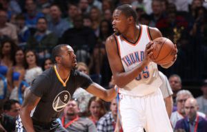 Toujours devant à l'entame du dernier quart, le Thunder ne faiblit pas, et reprendra même le large, comptant jusqu'à douze points d'avance dans la dernière période. Durant continue de porter les siens. Malgré des prises à deux et parfois à trois, le longiligne ailiers d'Oklahoma impressionne. Mais il était écrit que rien ne pouvait arriver aux Warriors cette saison là. Et alors que les locaux comptent encore 4 pts d'avance à 15 secondes du terme, c'est à ce moment précis que l'histoire va basculer. Klay Thompson, pas en reste ce soir là (32pts), dégaine à trois points et ramène son équipe. Durant hérite alors du ballon, et tandis que les Warriors doivent faire faute et que Billy Donovan dispose encore d'un temps-mort, KD envoie une vieille saucisse, interceptée par les Warriors. Terrible pour celui qui avait tenu son équipe tout le match.. Iguodala, seul à trois points, fait mine de shooter et rentrer dans la peinture et obtient la faute. Il ne tremblera pas et permettra à son équipe d'arracher une prolongation innespérée. Car avec 9 points de retard et moins de 4 minutes à jouer, cela relève presque du miracle. Sauf lorsque Curry fait partie de son équipe.