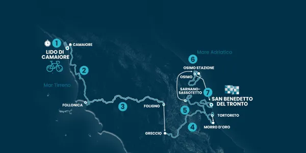 Les coureurs partent de la région des Abruzzes et traversent une série de montées avant d’entrer dans la région des Marches. Au début, la plupart des montées ont une moyenne de 4 à 5 %, mais progressivement, les pentes montent d’un cran au fil de l’étape.