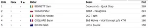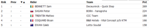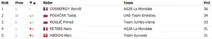 Sam Bennett conserve le maillot vert, Benoit Cosnefroy son maillot à pois. Tadej Pogacar reste en blanc (meilleur jeune).
