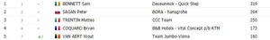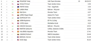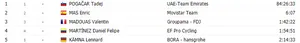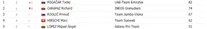 Du côté des grands perdants du jour, on retrouve Alejandro Valverde (Movistar). L’Espagnol ne décrochera pas un 20e top 10 sur un Grand Tour, après avoir concédé près de quatre minutes à Damiano Caruso. Mêmes déboires pour le Colombien Miguel Angel Lopez, qui cède sa place sur le podium à Richie Porte. De son côté, Richard Carapaz (Ineos), porteur du maillot à pois, n’est pas parvenu à conserver cette tunique. C’est l’inévitable Tadej Pogacar qui, grâce à sa victoire du jour, a repris 10 points dans ce classement et décroche ainsi son troisième maillot distinctif.