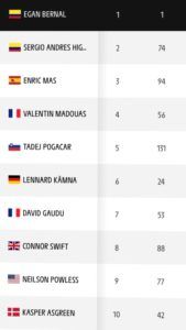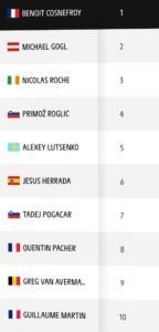 L'équipe Bora est toujours aux devants de la course au moment de l'ascension du Col de Peyronnenc. Le groupe de tête détient 2'32 d'avance sur Benoît Cosnefroy et Bennett à 10 km du sommet.