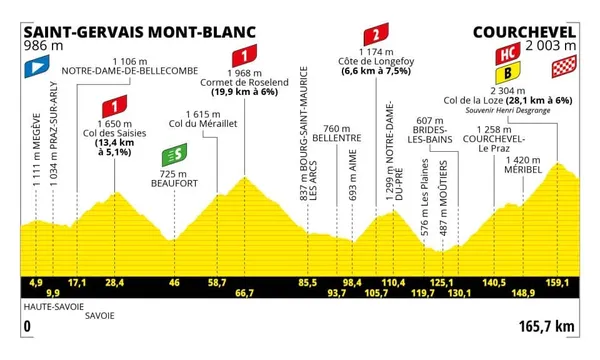 La 17e étape du Tour de France relie Sallanches à l’altiport dans les montagnes au-dessus de Courchevel. Le final comprend également le brutal col de la Loze, tandis que le parcours totalise 166 kilomètres La lutte pour l’échappée s’annonce rude. Après une section vallonnée de 15 kilomètres, les coureurs entrent dans le col des Saisies, une montée de 13,3 kilomètres à 5,3 %. L’itinéraire descend jusqu’à Beaufort pour reprendre l’ascension. Le Cormet de Rozelend est long de 19,9 kilomètres et affiche une moyenne de 6 %.