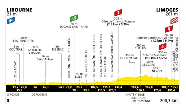 Une première partie plate accueille les coureurs cette fois-ci avant que le terrain ne soit plus accidenté dans les 75 derniers kilomètres. Trois ascensions se distinguent, la Côte de Champs-Romain (2,8 kilomètres à 5,2 %), la Côte de Masmont (1,3 kilomètre à 5,5 %) et la Côte de Condat-sur-Vienne (1,2 kilomètre à 5,4 %). Ces deux dernières se situent dans les 16 derniers kilomètres avant que la route ne s’aplanisse dans les 5 kilomètres précédant la ligne d’arrivée.