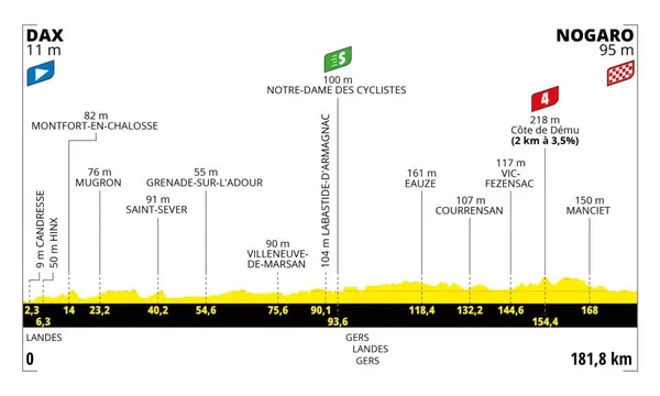 En effet, les 3 derniers kilomètres se déroulent sur la piste de course automobile avant que les hommes rapides n’aient la possibilité de s’imposer. Le parcours de la 4e étape du Tour n’est pas très spectaculaire. Des routes légèrement vallonnées éloignent les coureurs de la côte atlantique. La route va jusqu’à Vic-Fezensac à l’est avant de revenir vers l’ouest à près de 40 kilomètres de l’arrivée. Peu après avoir traversé Vic-Fezensac, la Côte de Dému présente les seules pentes de la journée avec des points pour le maillot à pois. Il s’agit de 2 kilomètres à 3,5 %, une montée qui devrait franchie facilement par le peloton.