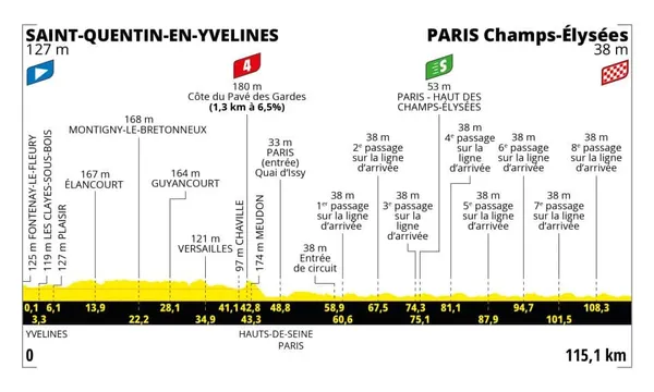 Les coureurs partiront de Montigny-le-Bretonneux, dans la commune de Saint-Quentin-en-Yvelines, au sud-ouest de Paris. Les coureurs approchent de la capitale française comme s’ils pédalaient vers la plage. Une coupe de champagne, une séance photo, un rythme très lent, tels sont les ingrédients de l’étape de parade de la dernière journée d’action. Mais dès que les coureurs s’engagent sur les pavés des Champs-Élysées, le peloton accélère. L’étape se termine par huit tours rapides de près de 7 kilomètres.