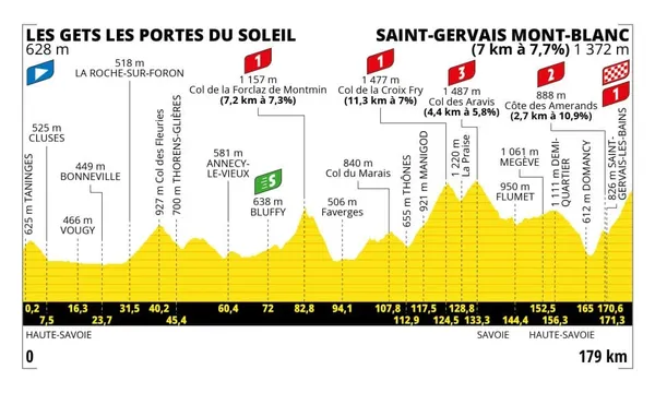 Cela fait sept ans que le Tour n’a pas visité la station de ski située à l’ombre du Mont Blanc. L’ascension de l’arrivée démarre en trombe après avoir traversé Saint-Gervais. Les premiers kilomètres sont marqués par une montée impitoyable de 12,9 % avant que la route ne continue à grimper à deux chiffres pendant 1,7 kilomètre. En fait, cette section s’appelle la Côte des Amérindiens. La route se stabilise ensuite un peu, avant de continuer à monter pendant 7,2 kilomètres à 7,7 %.