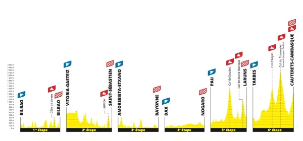 Les montagnes commencent lors de la cinquième étape avec un parcours de 165 km à travers les Pyrénées, de Pau à Laruns, avec le Col de Soudet et le Col de Marie Blanque avant l'arrivée.