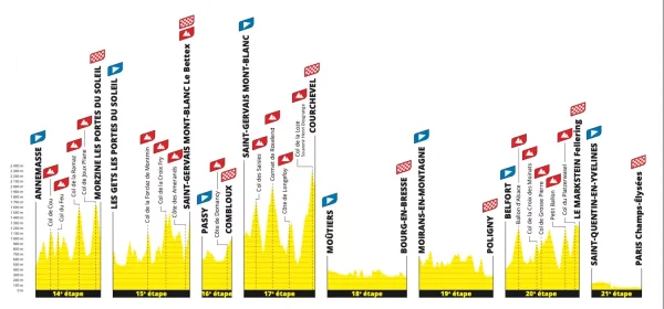 L'étape 17 vers Courchevel grimpe le Col de la Loze, à 2 304 m d'altitude, puis descend pour finir sur la piste de l'altiport. L'étape 20 est une dernière étape brutale de multi-montagne dans les Vosges entre Belfort et la station de ski du Markstein.