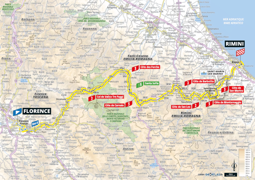 C'est en plein cœur de la Toscane que les 176 coureurs du Tour de France prendront leur envol pour les 3 semaines les plus attendues de l'été. Capitale de la Renaissance, Florence fera parler son charme à l'image de la cathédrale du Duomo, monument iconique de la ville. Le peloton quittera La Cité du Lys à 12 h 40 pour s'engager dans les routes escarpées italiennes. Direction la côte Adriatique et la ville de Rimini dans la région d'Émilie-Romagne.
