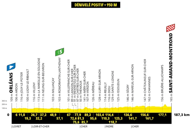 L’image parle d’elle-même, c’est tout plat ce mardi sur la route du Tour de France. Aucune ascension répertoriée. Il faudra tout de même noter la petite montée à quelques kilomètres de l’arrivée. Rien de bien dur pour les sprinteurs. Seul le vent pourra jouer un rôle sur cette journée pour empêcher le sprint massif. Les étapes vers Saint-Amand-Montrond firent souvent part à la bordure.