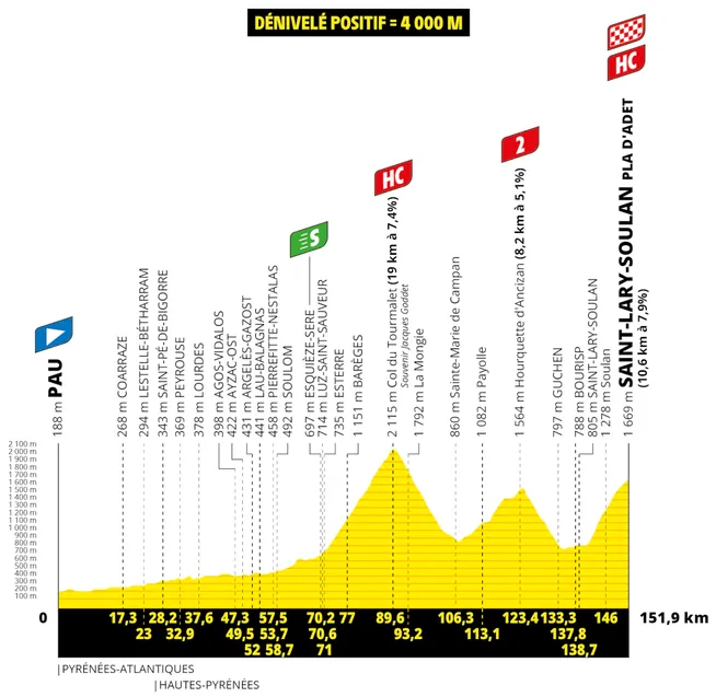 Une arrivée dans les routes escarpées du Pla d’Adet pour conclure cette 14ᵉ étape du Tour de France. Le peloton restera dans les Hautes-Pyrénées durant toute la seconde partie de l’étape. Le départ se fera lui depuis Pau dans les Pyrénées-Atlantiques. Des longues portions droites pour arriver au pied du Tourmalet. Les coureurs passeront également par Lourdes. Un passage dans le verrou du Lavedan qui pourrait offrir quelques miracles aux favoris. Départ donné à 13 h 20.
