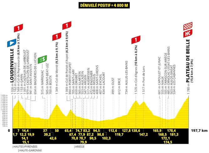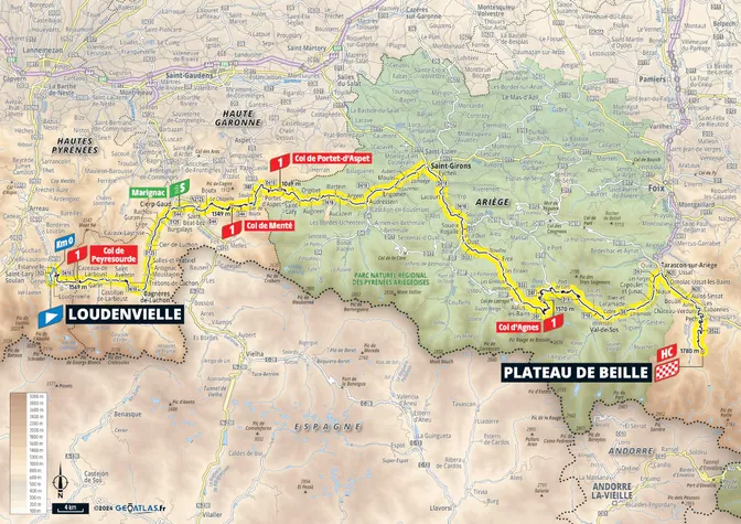 C’est dans les routes escarpées de l’Ariège que le peloton va gravir le mythique Plateau de Beille. Une étape qui se déroule majoritairement dans le Parc Naturel Régional des Pyrénées Ariégeoises avec notamment un passage du côté de Saint-Girons. Le départ de l’étape se fera du côté de Loudenvielle dans les Hautes-Pyrénées. Un départ donné à 12 h 05.