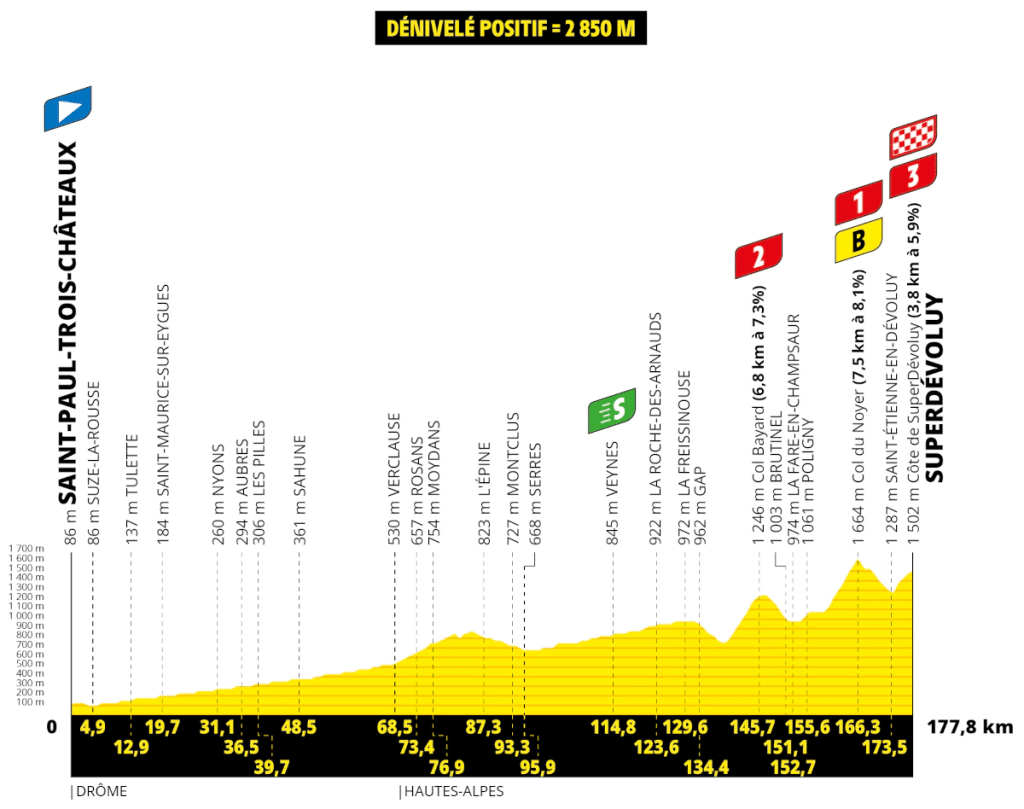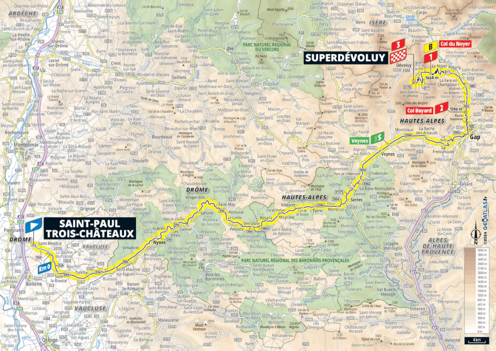 Une étape taillée pour baroudeur ce mercredi sur ce Tour de France 2024. Trois ascensions répertoriées dans les 40 derniers kilomètres. Avant ça, c'est un parcours relativement plat qui attend le peloton dans cette étape. 177,8 kilomètres et 2850 mètres de dénivelé positif. L'arrivée se fera au sommet de la Côte de Superdévoluy (3,8 kilomètres à 5,9% de moyenne). Avant ça les coureurs grimperont le Col de Bayard (6,8 kilomètres à 7,3% de moyenne) et le Col du Noyer (7,5 kilomètres à 8,1% de moyenne). La différence pourrait être faite dans ce col du Noyer.
