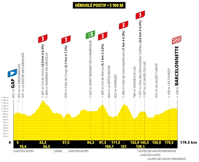 Une journée avec de 3100 mètres de dénivelé positif en moyenne montagne entre Gap et Barcelonnette. Une journée qui ne montera pas très haut en altitude, mais le peloton ne fera que monter descendre. Les montagnes russes sur cette 18ᵉ étape avec 5 montées répertoriées en 3ᵉ catégorie tout au long des 179,5 kilomètres.