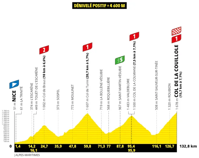 Étape courte ce samedi, mais pentue. Plus de 4600 mètres de dénivelé positif entre Nice et le Col de la Couillole. Quatre ascensions sont au programme, et ce, dès le départ de l’étape. Le peloton sera lancé dans la montée du Col de Braus (10 kilomètres à 6,6% de moyenne). Une première ascension qui permettra peut-être aux échappées de prendre du champ.