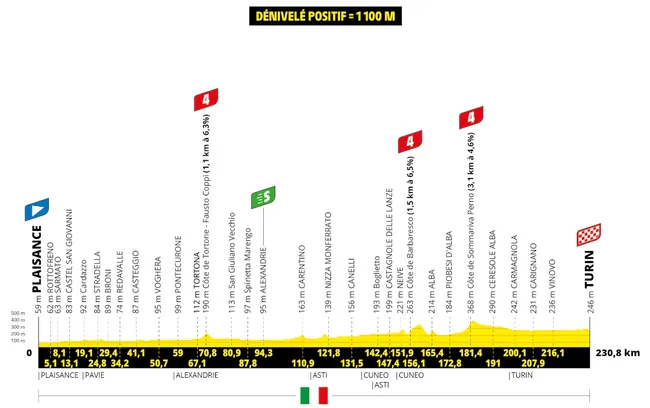 La première étape pour les sprinteurs aura lieu ce lundi 1ᵉʳ juillet sur les routes du Tour de France. Le peloton parcourra 230,8 kilomètres et 1100 mètres de dénivelé positif entre Plaisance et Turin pour la dernière étape du triptyque italien.