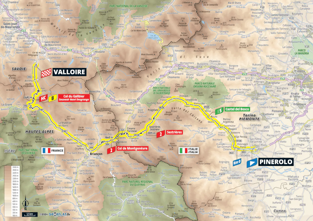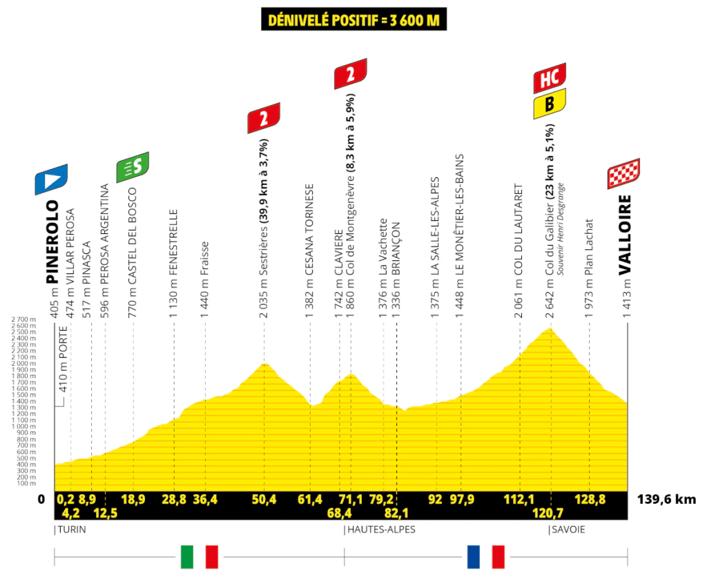 C'est la première étape de haute montagne ce mardi 4 juillet entre Pinerolo et Valloire. 139,6 kilomètres avec plus de 3600 mètres de dénivelé positif. Trois ascensions répertoriées durant la journée, les montées de Sestrières (39,9 kilomètres à 3,7% de moyenne) et du col de Montgenèvre (8,3 kilomètres à 5,9% de moyenne) feront office d'échauffement avant la dernière ascension du mythique Galibier. La montée de 23 kilomètres à 5,1% de pente moyenne permettra aux favoris de s'exprimer sur cette montée par le versant comprenant également le col du Lautaret. Les 8 derniers kilomètres du géant alpestre sont très irréguliers avec des passages à plus de 9 % ainsi que des replats permettant de souffler. Après le souvenir Henri Desgrange, le peloton s'élancera dans la longue descente vers Valloire ou des différences pourront être faites.