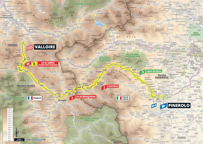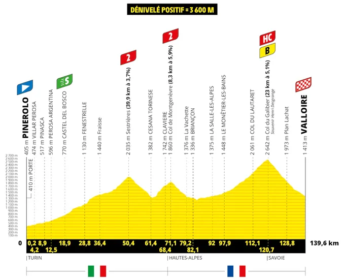C’est la première étape de haute montagne ce mardi 4 juillet entre Pinerolo et Valloire. 139,6 kilomètres avec plus de 3600 mètres de dénivelé positif. Trois ascensions répertoriées durant la journée, les montées de Sestrières (39,9 kilomètres à 3,7% de moyenne) et du col de Montgenèvre (8,3 kilomètres à 5,9% de moyenne) feront office d’échauffement avant la dernière ascension du mythique Galibier. La montée de 23 kilomètres à 5,1% de pente moyenne permettra aux favoris de s’exprimer sur cette montée par le versant comprenant également le col du Lautaret. Les 8 derniers kilomètres du géant alpestre sont très irréguliers avec des passages à plus de 9 % ainsi que des replats permettant de souffler. Après le souvenir Henri Desgrange, le peloton s’élancera dans la longue descente vers Valloire ou des différences pourront être faites.