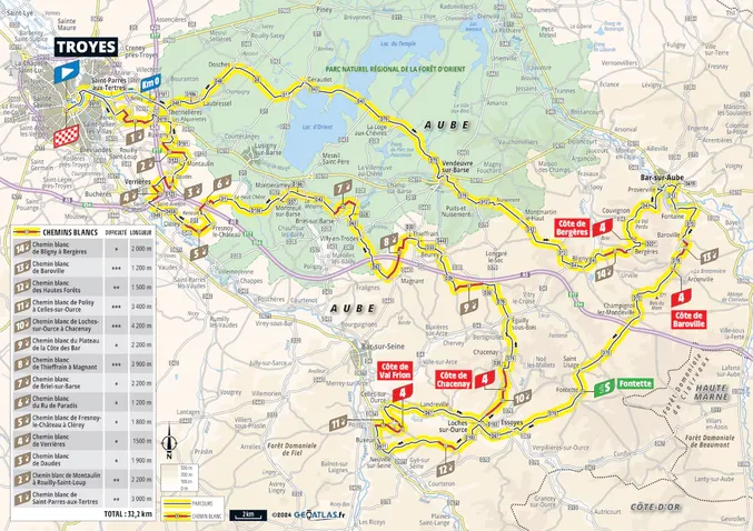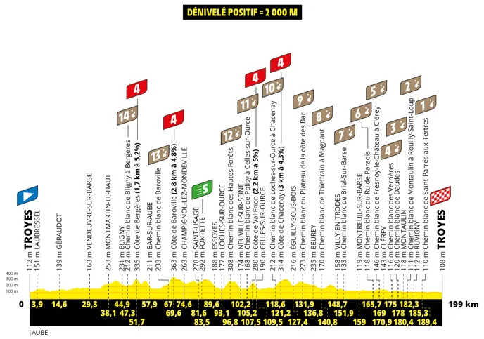 Plus de 2000 mètres de dénivelé positif ce dimanche entre Troyes et Troyes. 14 chemins blancs dans une étape explosive qui promet d’en mettre partout. Après un début plutôt plat et assez tranquille le peloton va rapidement rentrer dans le vif du sujet avec dès le 44ᵉ kilomètre le premier chemin blanc de la journée. À partir de là, aucun répit pour les coureurs qui enchaineront les ascensions de petites côtes et des chemins blancs. Un tracé des Strade Bianche made in France. La fin de l’étape ne laissera pas de place au hasard avec 7 chemins blancs dans les 30 derniers kilomètres.