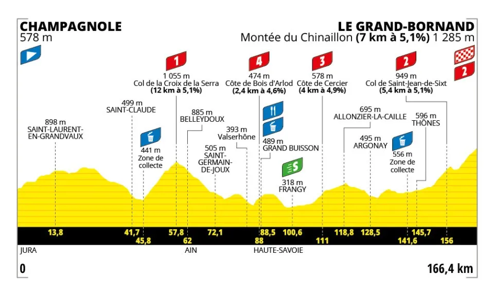 Étape de montagne ce samedi sur les routes du Tour. 166 kilomètres avec l’ascension de la Montée du Chinaillon (7 kilomètres à 5,1% de moyenne) menant vers le Grand-Bornand. Pas beaucoup de plat pour cette première étape dans la communauté de communes des Vallées de Thônes. Au total, il y aura 5 ascensions dont les deux dernières classées en 2ᵉ catégorie.