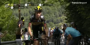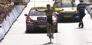 Présent dans le grand groupe de 32 coureurs pour se disputer la victoire d’étape, Sepp Kuss peut compter sur la présence de Wout van Aert, équipier de luxe. Les deux coureurs de la formation Jumbo-Visma ont flairé le bon coup et passent la journée à l’avant, jusqu’au petit numéro de Sepp Kuss.