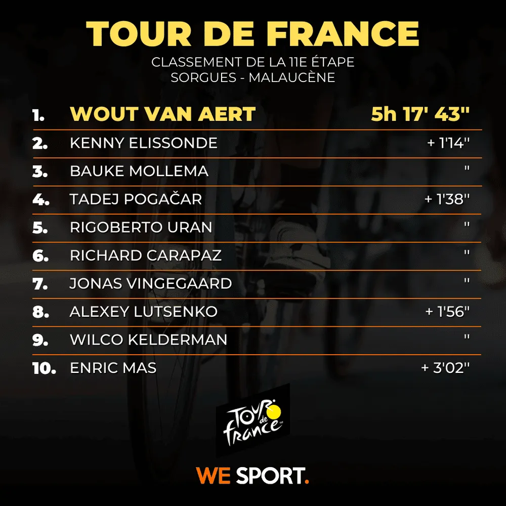 Deux passages sur le Mont Ventoux sont au menu de la 11e étape du Tour de France 2021. Une étape où Wout Van Aert (Jumbo-Visma) s’est imposé après 199 km de course. Voici le résumé d’une étape vertigineuse dans le Vaucluse.