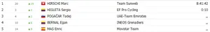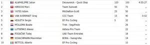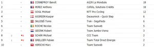 Alexander Kristoff conserve le maillot vert, Benoît Cosnefroy prend celui à pois, tandis que Marc Hirschi hérite du maillot blanc.