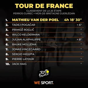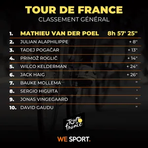 Intouchable, ce dernier dompte Mûr-de-Bretagne. Le Néerlandais décroche sa première victoire pour sa première participation au Tour de France. Avec ce succès, Mathieu van der Poel s’empare également du maillot jaune. Tout un symbole, pour le petit fils de Raymond Poulidor.