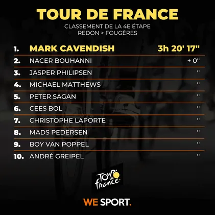 Ce mardi se déroulait la 4e étape du Tour de France, la dernière en Bretagne allant de Redon à Fougères. Une étape encore destinée aux sprinteurs qui était plus courte que les premières (150,4 km). C’est Mark Cavendish qui s’est imposé au sprint final.