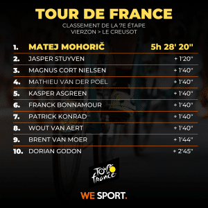 Le Slovène a raflé tous les points pour revêtir le maillot à pois. Pour la première difficulté de la journée, Brent Van Moer lance une attaque, il est suivi de Matej Mohorič qui réussit à lui passer devant au sommet de la côte de Château-Chinon. Un duo de tête se forme avec ces deux coureurs qui distancent les poursuivants. Des poursuivants qui lancent des attaques chacun leur tour mais qui ne s’entendent plus et laissent filer les hommes de tête. Ils sont ensuite rejoints par Jasper Stuyven et Victor Campenaerts et sont désormais quatre pour creuser l’écart. À 19 km de l’arrivée, Matej Mohorič parvient à se défaire des autres et est désormais seul en tête.