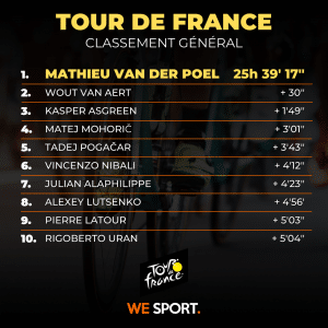 La formation UAE Emirates qui n’a pas de coureur en tête de course pousse le peloton pour essayer de rattraper l’échappée mais elle est seule, aucune formation ne prend le relais. L’écart se creuse entre les deux groupes avec environ 1 min de plus par tranche de 10 km. Tadej Pogačar, deuxième du général, voit ses chances de revêtir le maillot jaune dans ce Tour s’amenuiser. Primoz Roglič a quant à lui complètement craqué à la fin de l'étape et peut faire une croix sur la victoire finale puisqu'il accuse 9 minutes de retard sur Mathieu van Der Poel au classement général.