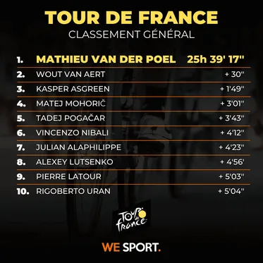 La formation UAE Emirates qui n’a pas de coureur en tête de course pousse le peloton pour essayer de rattraper l’échappée mais elle est seule, aucune formation ne prend le relais. L’écart se creuse entre les deux groupes avec environ 1 min de plus par tranche de 10 km. Tadej Pogačar, deuxième du général, voit ses chances de revêtir le maillot jaune dans ce Tour s’amenuiser. Primoz Roglič a quant à lui complètement craqué à la fin de l’étape et peut faire une croix sur la victoire finale puisqu’il accuse 9 minutes de retard sur Mathieu van Der Poel au classement général.