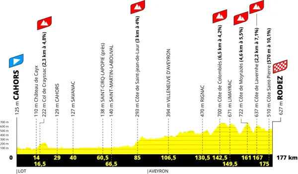 L’étape 4 sera l’étape la plus longue du Tour de Frances 2023, avec 177 km. La première moitié n’offre pas beaucoup d’action pour le peloton, mais elle échauffe les jambes des coureuses pour la deuxième moitié de l’étape, où ils devront affronter un certain nombre d’ascensions épuisantes les unes après les autres. L’étape se terminera sur la courte mais percutante Côte Saint-Pierre. Le final à Rodez s’annonce explosif.