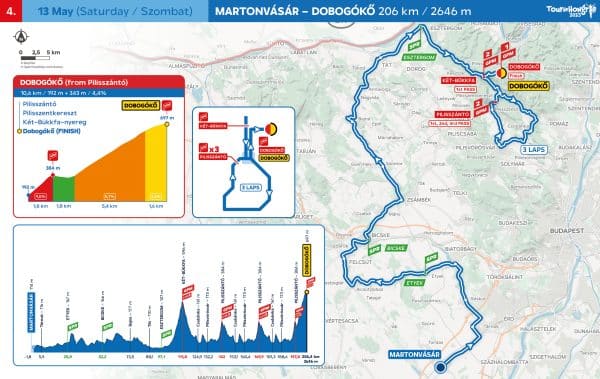 L'étape reine du Tour de Hongrie 2023 aura lieu le 13 mai. Le parcours de 206 km comprend cinq ascensions catégorisées et 2646 mètres de dénivelé. Martonvásár ouvrira le bal pour la première fois de son histoire. Les coureurs devront ensuite affronter trois sprints intermédiaires avant d'atteindre le mont Pilis. Les routes cyclables les plus populaires du pays seront utilisées, le parcours comporte trois fois la montée de Pilisszántó, longue de 2 km, avec une pente moyenne de 9 %. Après le dernier tour vient la seule montée de première catégorie de la course : Dobogókő. Sa pente moyenne de 5,2 % est trompeuse : le dernier kilomètre est presque entièrement plat.