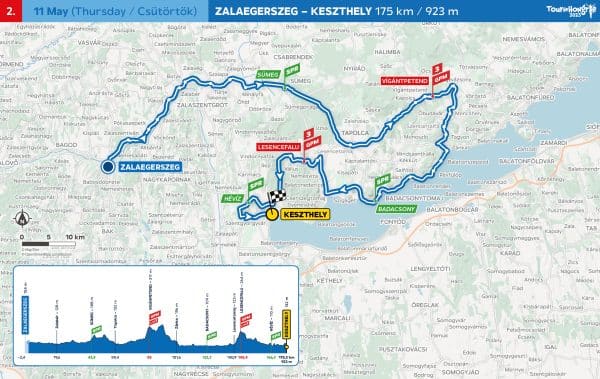 Zalaegerszeg accueille pour la première fois une étape. Le parcours emmène le peloton vers Nagyvázsony, avant de tourner vers le sud et d'atteindre les rives nord du lac Balaton. Deux ascensions de 3e catégorie et trois sprints intermédiaires attendent les coureurs, qui termineront l'étape à Keszthely, à côté du célèbre château de Festetics. L'étape 2 ne comprend que 900 mètres de dénivelé, ce qui indique que les sprinters se battront pour la victoire.