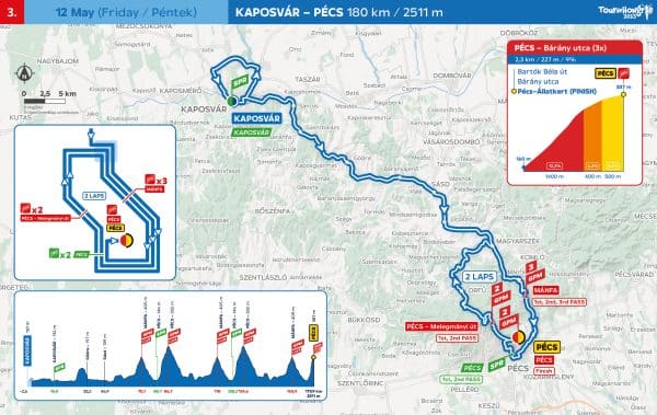 Le 12 mai sera une journée importante pour le classement général. Après un court tour de Kaposvár, le peloton se dirige vers le sud pour atteindre le mont Mecsek et sa capitale, Pécs. Le parcours vallonné comprend six ascensions classées et plus de 2500 mètres de dénivelé total. La plus difficile est la rue Bárány : cette montée de 1,5 km a une pente moyenne de plus de 11 %, avec des sections allant jusqu'à 20 % ! Les coureurs devront s'attaquer à ce monstre à trois reprises, avant de terminer l'étape à quelques centaines de mètres du sommet, devant le zoo de Pécs.