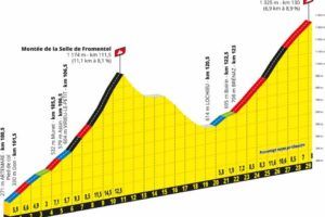 Irrégulière et parfois ponctuée de replat, la première ascension du col du Grand Colombier est une mise en bouche très salée. Celle-ci se nomme Stelle de Fromentel car les coureurs n'iront pas jusqu'au sommet par ce versant. En effet, avec ses nombreux passages au dessus de 12%, la pente sera soutenue et droite. Des passages au-dessus de 12% qui dureront plus de trois kilomètres, durant lesquels il n'y aura aucun répit, aucun replat. Une fois ces passages terminés, les coureurs prendront sur leur gauche direction Lochieu pour attaquer l'ascension du col de la biche.