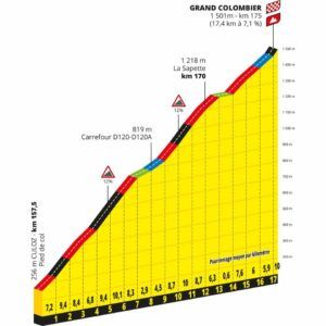 Après un petit faux-plat, les coureurs seront au pied de ce col méconnu. Emprunté lors du Tour de France 2017, il fut toutefois escaladé par son autre versant. La partie abordée pour cette étape est régulière et difficile. En effet, la pente oscille toujours entre 7 et 13%.