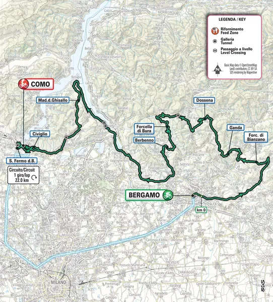 Après avoir quitté Bergame, les coureurs s’attaquent au Forcellino di Bianzano après 29 km, avant la montée plus longue du Ganda, qui a servi de tremplin à l’action décisive de Pogačar il y a un an. La longue section d’ouverture de la course à travers la province de Bergame se poursuit avec la montée du Passo della Crocetta à Dossena après 70 km avant que les ascensions de la Forcella di Bura et du Colle di Berbenno n’amènent la course vers son point médian.