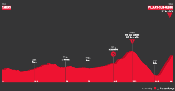 Villars-sur-Ollon a vu des coureurs comme Chris Froome s'y imposer, et accueillera de nouveau une arrivée cette année. La journée de 143 kilomètres est essentiellement plate dans la première partie. La plupart de l'étape est plate, jusqu'au Col des Mosses où 13,5 kilomètres à 4,1% attendent les coureurs. Ce n'est pas la plus facile des montées avec quelques pentes plus fortes, mais c'est loin d'être l'ascension la plus difficile de la saison. Les coureurs descendront ensuite jusqu'à Aigle, où l'UCI est basée, pour atteindre l'ascension finale.