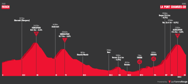 Encore une longue montée. C'est un final différent de ceux des jours précédents, le sommet de l'Albulapass se trouve à seulement 9,5 kilomètres à parcourir avant une arrivée en ligne droite à La Punt. Les écarts au sommet seront probablement ceux de la ligne d'arrivée après une descente très rapide.