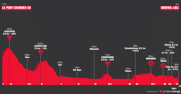 Les coureurs remontent le col de l'Albulapass en sens inverse pour commencer la journée, 8,9 kilomètres à 6,8%. Après une descente rapide vient une ascension de 7,5 kilomètres à 7,5%. Ce sont des routes où une échappée peut creuser l'écart sur le peloton. Les coureurs ayant perdu du temps lors des étapes précédents voudront certainement se glisser dans l'échappée matinale. Les places risquent d'être chère. Le parcours ressemblent beaucoup à une classique ardennaise avec un profil valloné, un final explosif et peu de répit pour les coureurs.