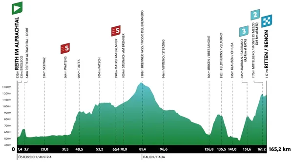 Le sommet du Lavazè se trouve à une altitude de 1 808 mètres, ce qui en fait le plus haut sommet du Tour des Alpes de cette année. Les coureurs entament ensuite une descente rapide et très longue sur une route large et lisse. Après avoir atteint le point le plus bas de la journée à Cardano (290 mètres), la route suit la Valle Isarco et la Val Pusteria en amont, donc en légère montée. Plusieurs sections sont un peu plus raides jusqu’à ce que la ligne d’arrivée soit franchie pour la première fois à 37,4 kilomètres.